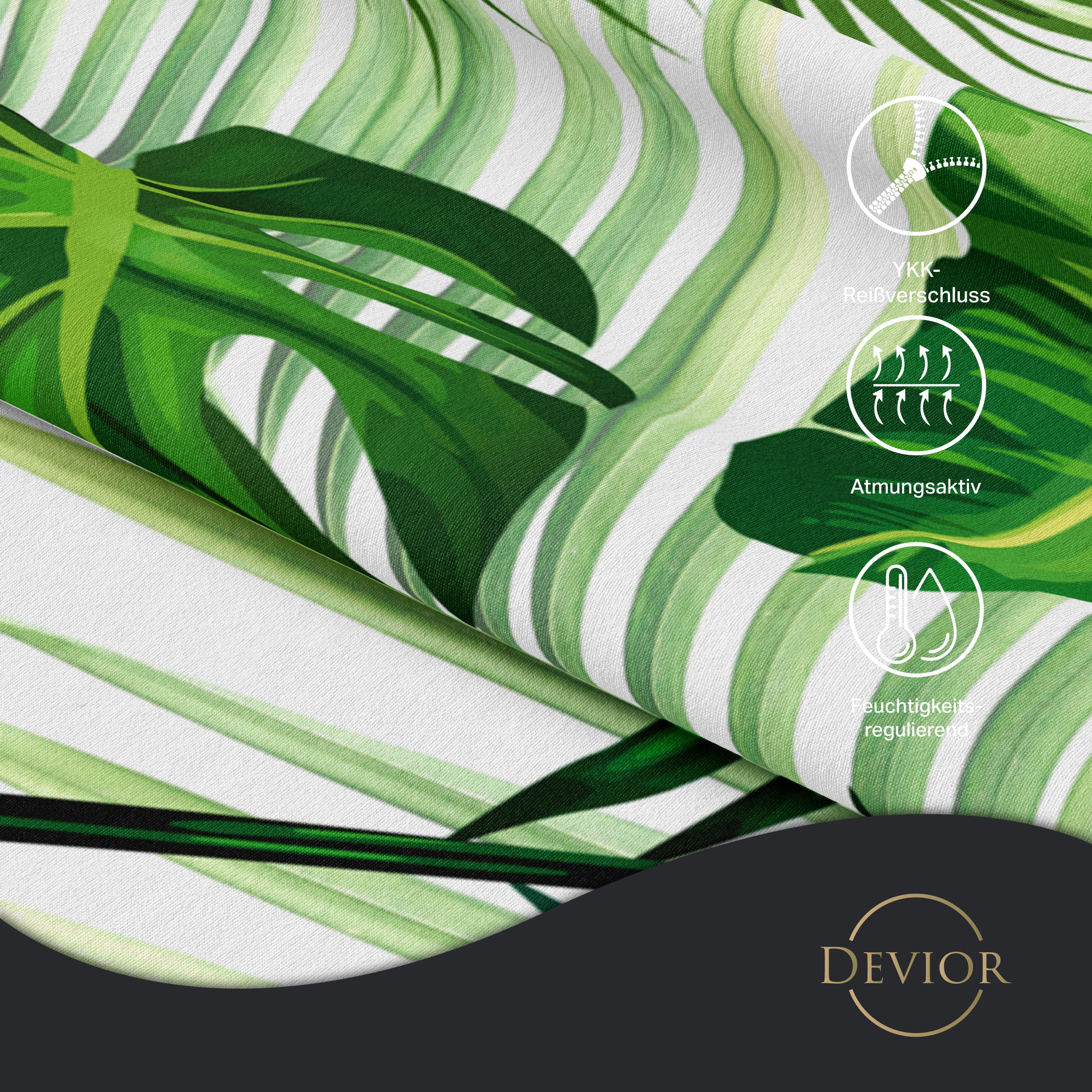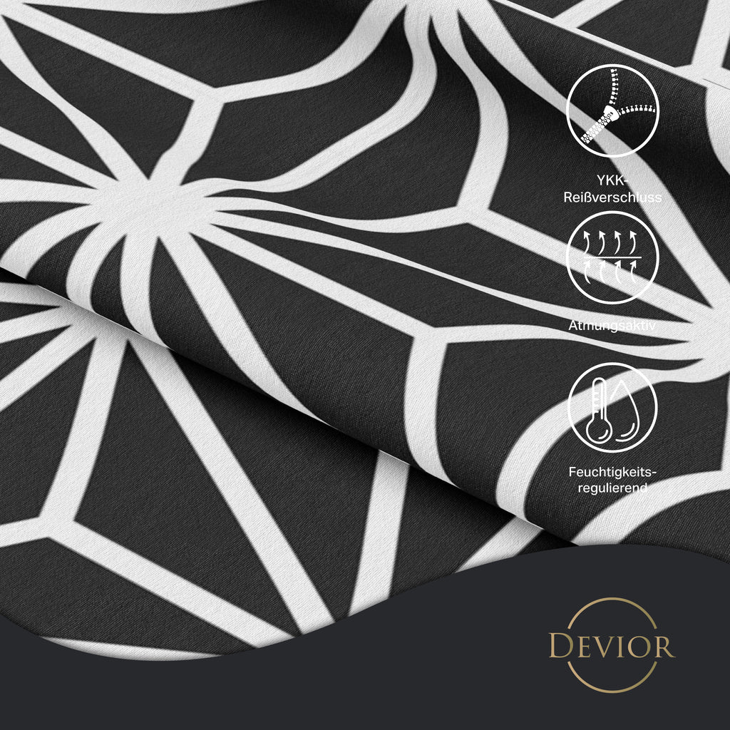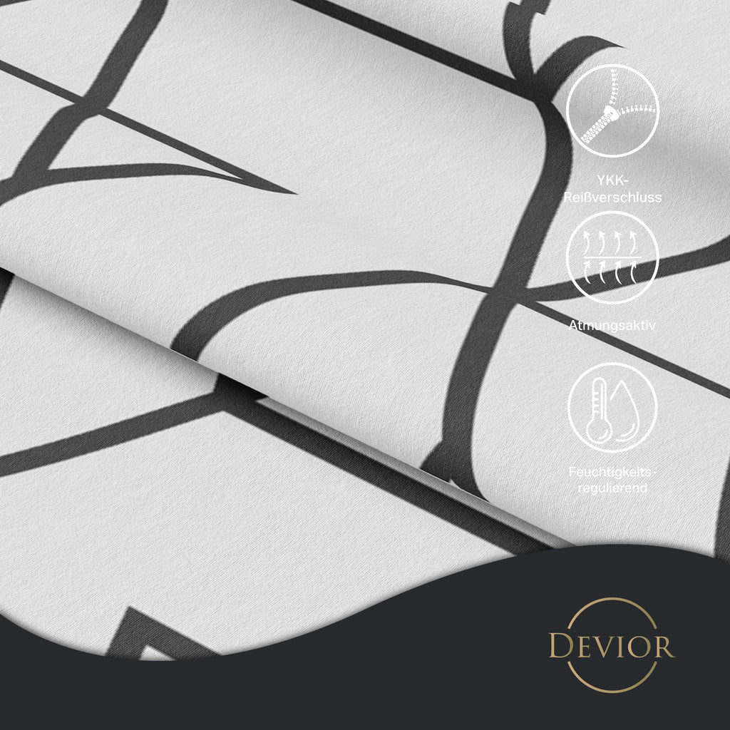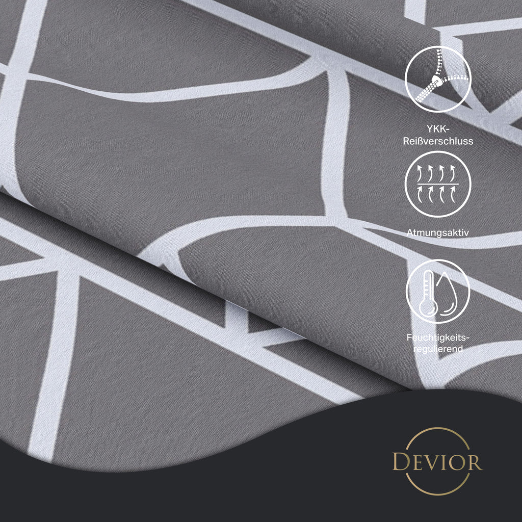 Das Devior Set zeichnet sich durch einen verdeckten, qualitativ hochwertigen YKK-Reißverschluss aus, der Komfort mit Strapazierfähigkeit verbindet. Hautsympathisch und feuchtigkeitsregulierend, unterstützt es einen ungestörten Schlaf, während die atmungsaktive Qualität für eine ausgeglichene Temperatur sorgt.