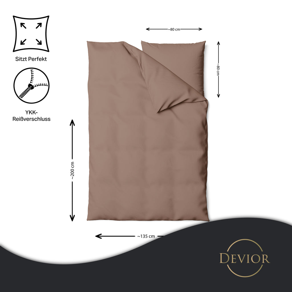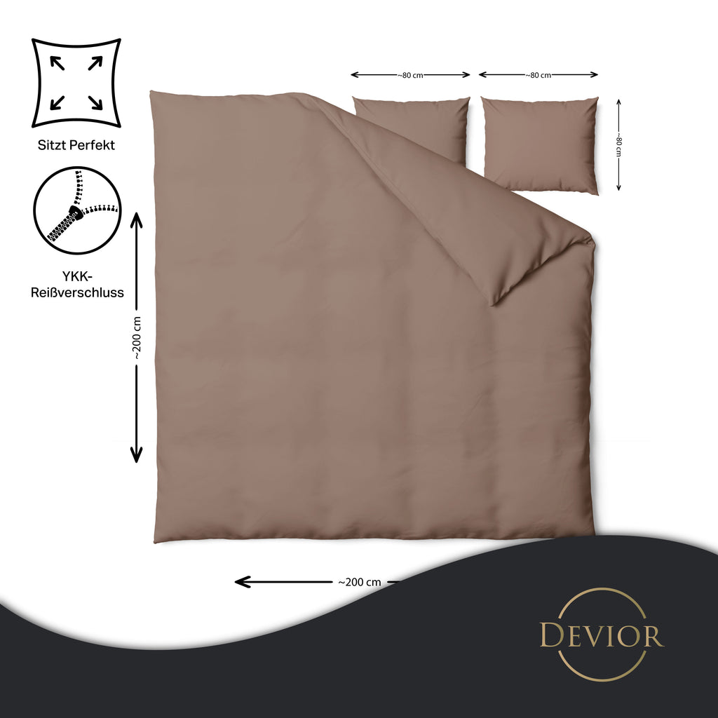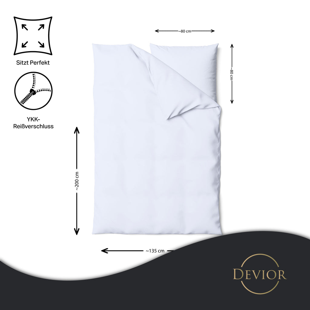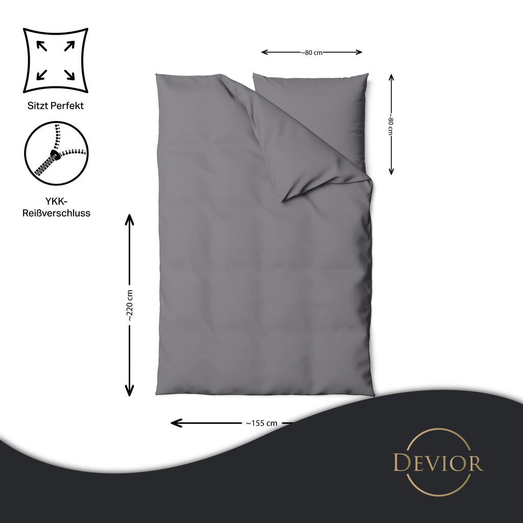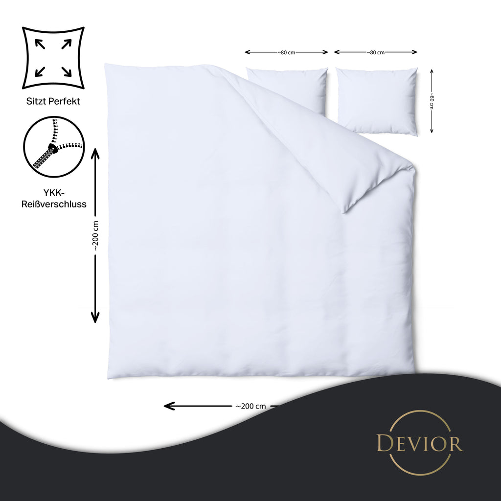 Das Devior Set zeichnet sich durch einen verdeckten, qualitativ hochwertigen YKK-Reißverschluss aus, der Komfort mit Strapazierfähigkeit verbindet. Hautsympathisch und feuchtigkeitsregulierend, unterstützt es einen ungestörten Schlaf, während die atmungsaktive Qualität für eine ausgeglichene Temperatur sorgt.