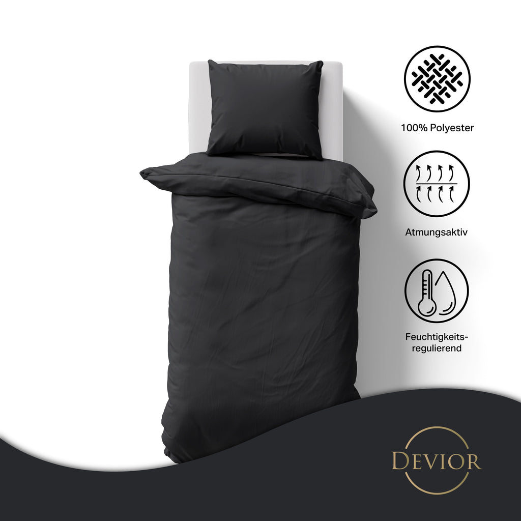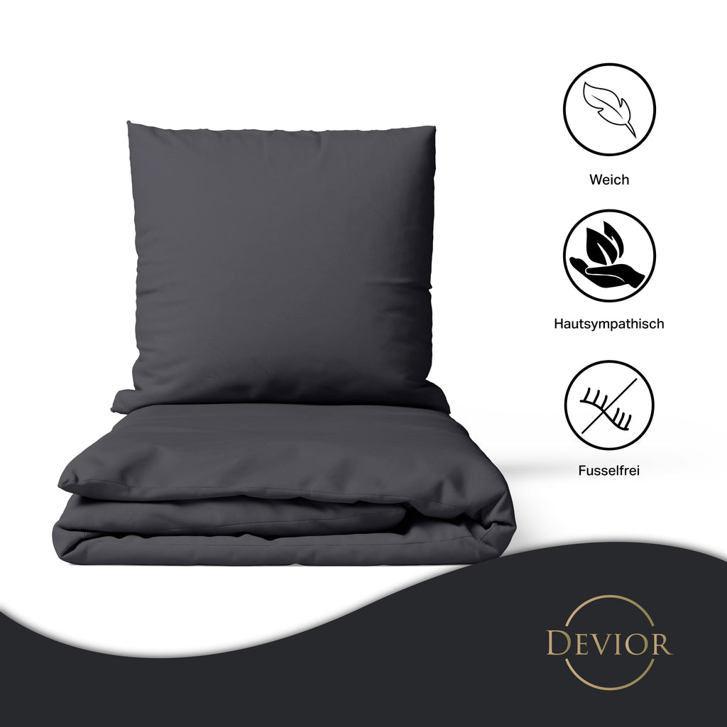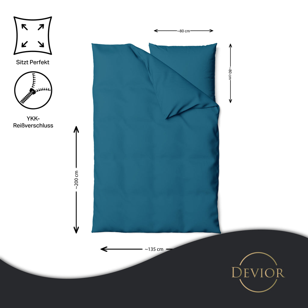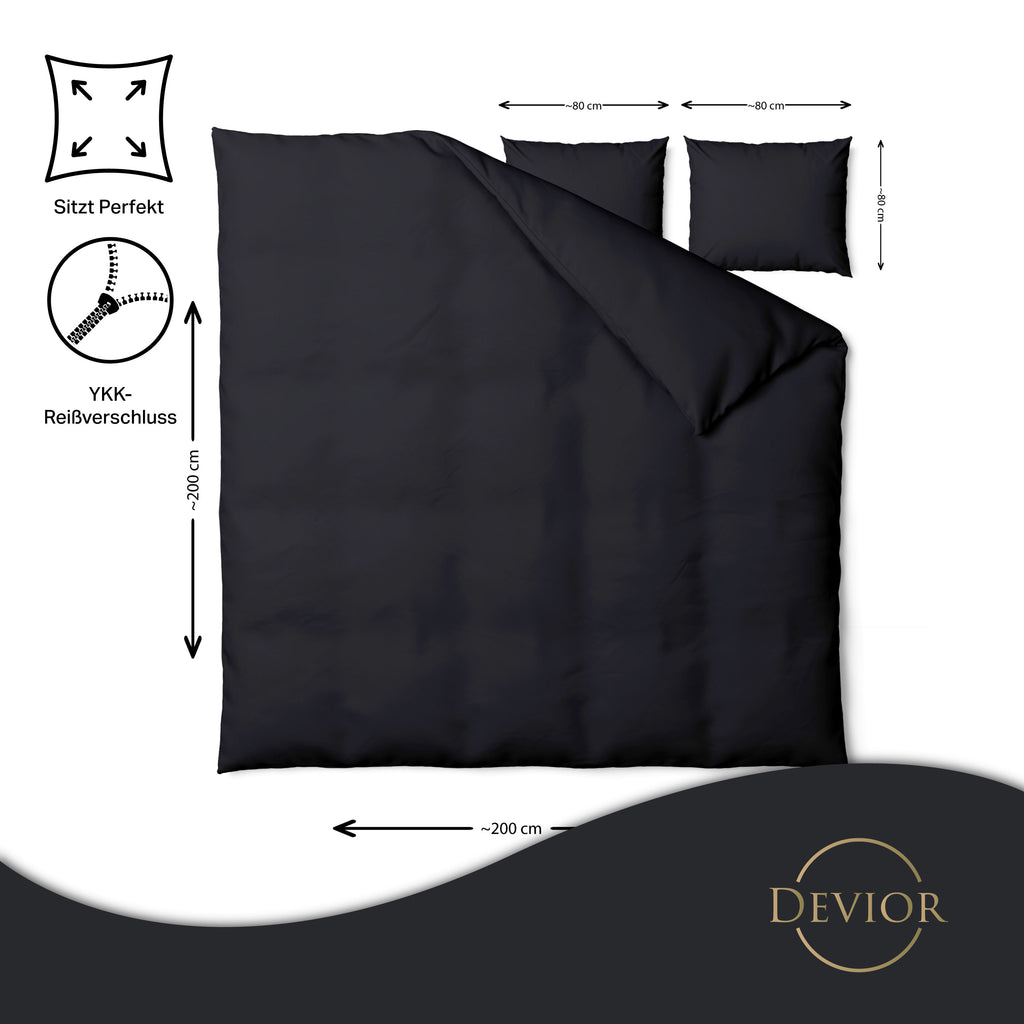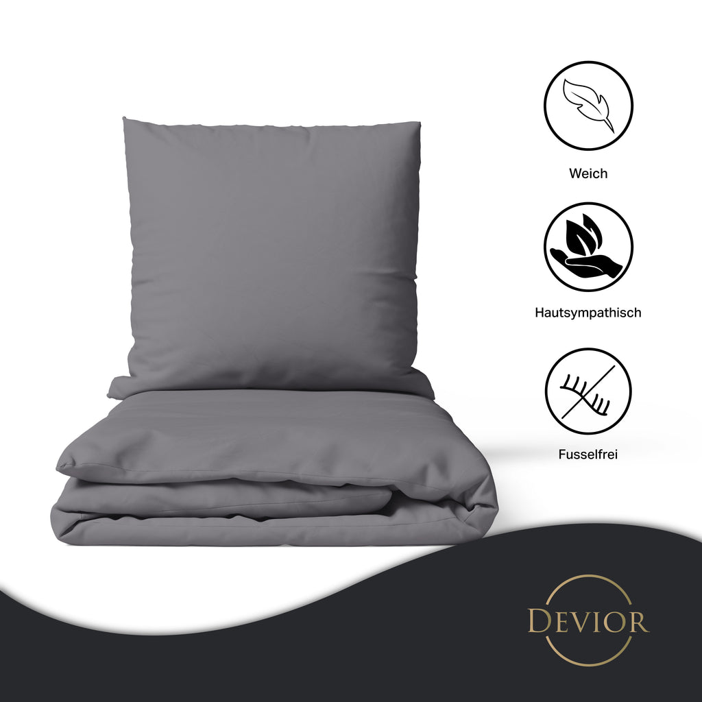 Das Devior Set zeichnet sich durch einen verdeckten, qualitativ hochwertigen YKK-Reißverschluss aus, der Komfort mit Strapazierfähigkeit verbindet. Hautsympathisch und feuchtigkeitsregulierend, unterstützt es einen ungestörten Schlaf, während die atmungsaktive Qualität für eine ausgeglichene Temperatur sorgt.
